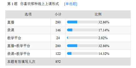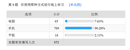 没有调查研究就没有发言权。在正式线上教学第一天结束后,科研质评办在第一时间利用问卷星对852名学生的线上学习情况进行了调研,包括线上学习条件、学生更喜欢的教学方式、教学平台是否实用流畅等问题。回收调查问卷后,在数据分析的基础上,全方位了解学生的学习需求,将调查结果提供给各教学部,为教师完善提升线上教学策略提供依据。